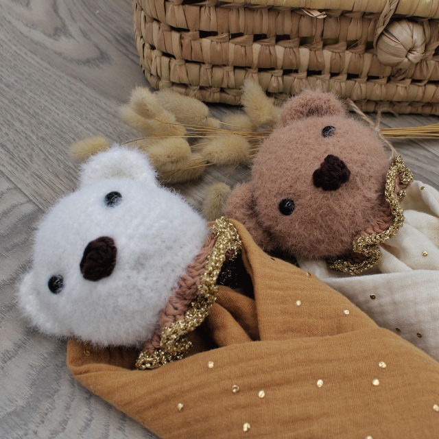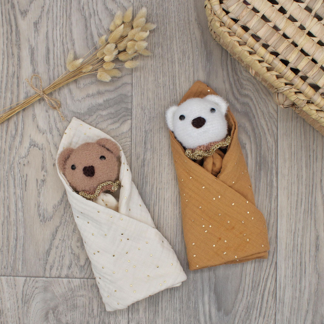 Le doudou ourson allie une tête d’ourson réalisée au crochet dans un fil tout doux brun ou blanc. La collerette de l’ourson est camel avec le bord doré. Le « corps » est en double gaze de coton écrue à pois dorés pour l’ours brun et camel à pois dorés pour l’ours blanc. La personnalisation est en doré.