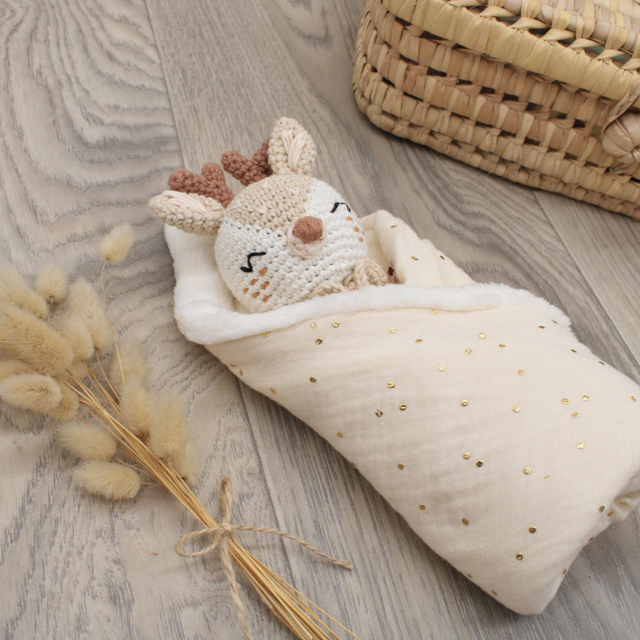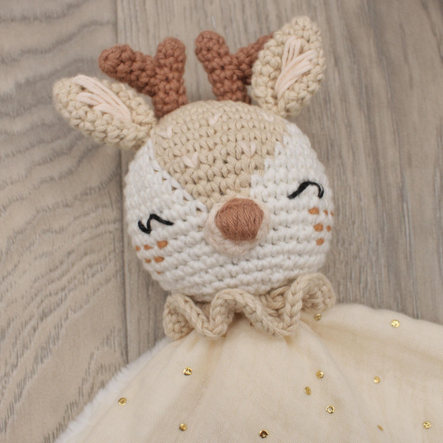 Le doudou biche de la collection Charline allie une tête de biche réalisée au crochet dans des couleurs douces : écru, blanc et marron clair. La collerette de la biche est écrue. Le « corps » est en double gaze de coton écrue à pois dorés sur le devant et fausse foururre lapin écrue. La personnalisation est en doré.