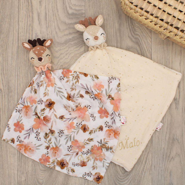 Vous avez la possibilité ou non, de personnaliser votre doudou en brodant le prénom de votre tout petit ou d’y broder un manogramme (lettre entourée d’une couronne de fleurs).