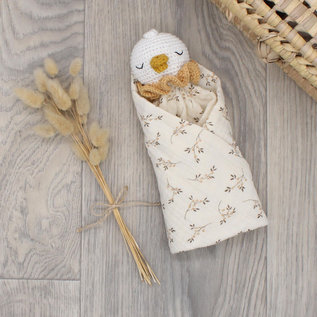 Le doudou oie de la collection Louison allie une tête d’oie réalisée au crochet dans des couleurs douces: blanc et moutarde. La collerette de l’oie est ocre. Le « corps » est en double gaze de coton blanc cassé à motifs d’églantier. La personnalisation est en doré.